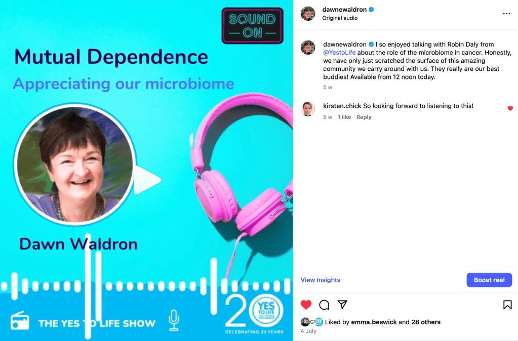 I so enjoyed talking with Robin Daly from @YestoLife about the role of the microbiome in cancer. Honestly, we have only just scratched the surface of this amazing community we carry around with us. They really are our best buddies! Available from 12 noon today.